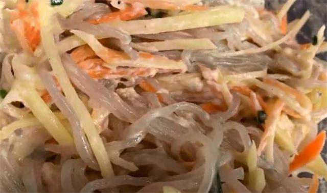 8.準備一個大碗,將土豆絲倒進來,胡蘿卜絲也加進來,再把粉條也加進來,蔥花也倒進來,往里面加入一勺食鹽,適量的胡椒粉,將它們攪拌均勻。