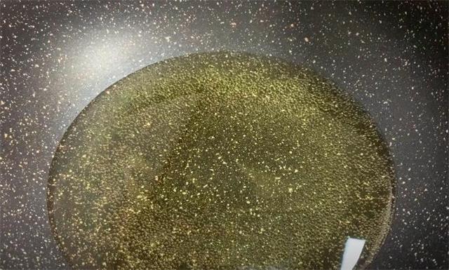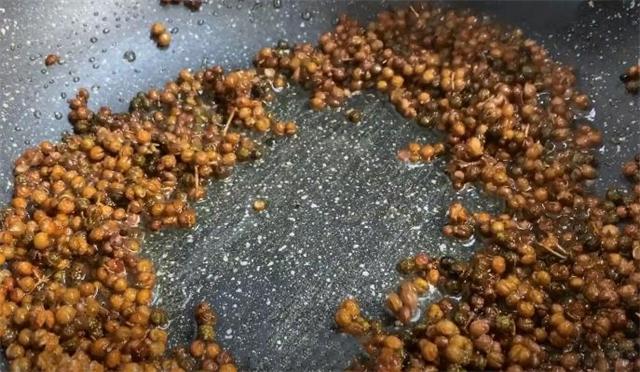 6.鍋里加入一勺剛才蒸好的花椒油,把過濾出來的花椒放進去炸,千萬不要將所有的花椒油倒進去炸,這樣花椒油的麻味就很容易揮發了,開小火炸,將花椒的香味徹底激發出來,要注意的是一定要用小火慢慢的炸,千萬不要炸糊了,那樣會有很重的苦味,炸大概30秒就可以了。