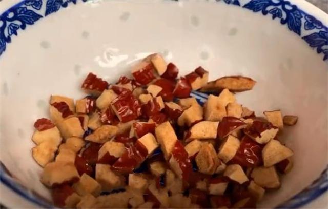 6.中間帶棗核的也不要浪費了,我們把它兩邊切下來,把切下來的棗肉改刀切成小丁,切好以后放碗里面備用。