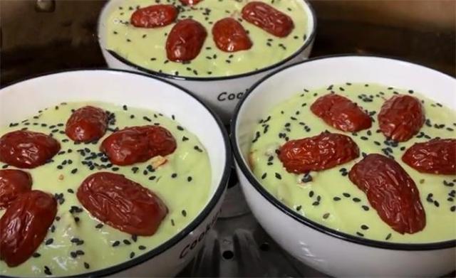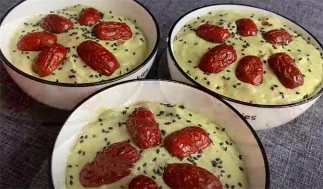 9.下面我們準備三個小碗,在碗里面刷上一層油,不需要刷太多,薄薄的一層就可以了,然后把洗凈的葡萄干放進碗里面,每個碗里放幾粒就可以,再把面糊慢慢倒進來,注意不要倒太滿,倒八分滿就可以,全部倒好以后用勺子把面糊表面整理平整,然后在面糊的表面也刷上一層油,鎖住水分,最后把切好的紅棗片像這樣一個一個的擺在面糊上面,像這樣擺上一圈就可以,全部擺好以后在上面撒上一點黑芝麻。