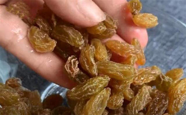 7.接下來我們準備一把葡萄干,往里面加入一勺面粉,用筷子把它攪拌一下,使所有的葡萄干都裹上一層面粉,因為葡萄干表面有很多的褶皺,里面藏著很多的灰塵和雜質,我們用面粉可以有效的把這些臟東西吸附出來,攪拌好以后往里面加入適量的清水,把它輕輕搓洗一下,洗一遍以后把它撈出來控水,再次加入清水,把它多清洗幾遍,洗到水變得清澈就可以,看一下,現在我們的葡萄干已經清洗得非常干凈了,把它放一邊備用。