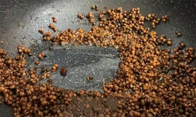 5.再取一勺蒸好的花椒油倒進鍋里面,然后把過濾出來的花椒倒進去炸一下,這里要注意的是,千萬不要把所有的花椒油都倒進鍋里炸,這樣花椒油的麻香味就很容易揮發掉了,開小火炸,將花椒的香味徹底激發出來,一定要用小火慢慢的炸,這里一定不能著急,如果花椒炸糊了,做出來的花椒油就會有很重的苦味,炸大概30秒左右就可以。
