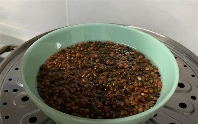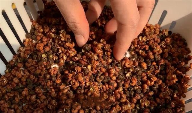 2.接下來把兩種花椒一起倒進大碗中,加入清水把花椒清洗一下,不用洗太久,把表面的灰塵和雜質都洗掉就可以,洗干凈以后用濾網把花椒過濾出來,然后倒進籃子里面,瀝干水分,如果為了節約時間也可以借助吹風機吹干,注意吹風機的距離要離的遠一些,要不然花椒都被吹走了,如果有太陽的話也可以放在太陽底下繼續曬干一點,像這樣表面完全沒有水分就可以,這個時候把花椒倒進碗里面備用。