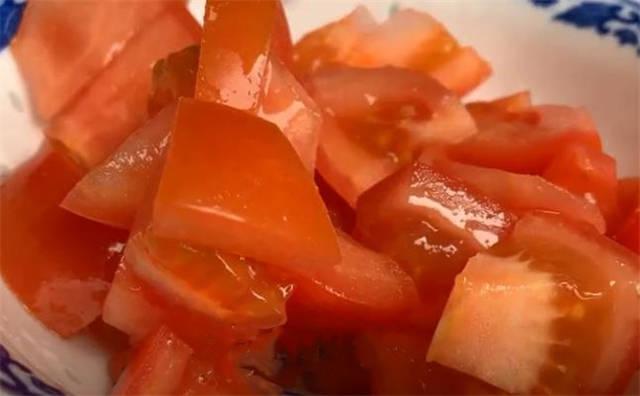 4.準備一個西紅柿對半切開,中間的硬心切掉不要,先把它切成大塊,再改刀切成小塊,切好放碗里面?zhèn)溆谩?/p>