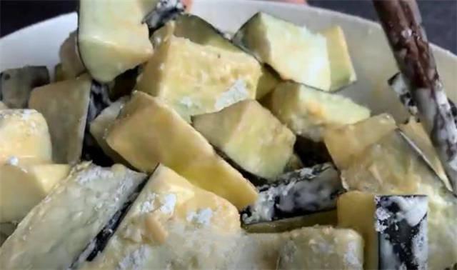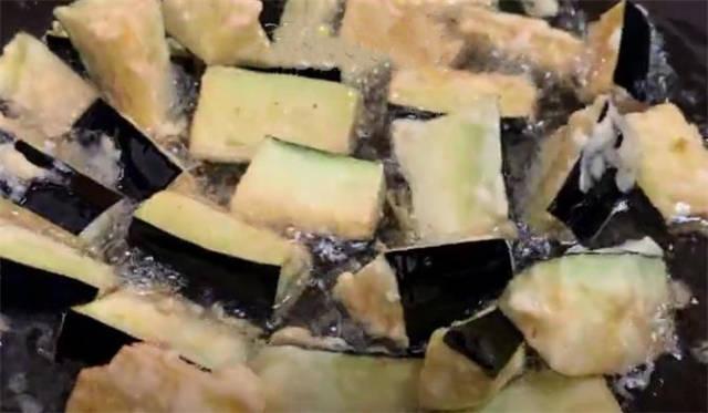 7.攪拌均勻以后往鍋里多倒一點食用油,開大火燒,試一下油溫,筷子放進去起小泡就可以,然后把茄子放進去炸一下,如果茄子太多的話可以分兩鍋炸,炸的時候用筷子不停地翻動,避免茄子的一面炸糊了,全程都要開大火炸,小火炸的話茄子容易吸油,炸至茄子兩面變得金黃就可以,先把它撈出來放進盤子里面。