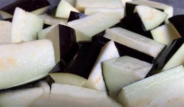 1.先把茄子的蒂切掉不要,再把它切成3公分左右的長段,茄子的皮千萬不要削掉,因為茄子皮含有豐富的花青素,可以美容養(yǎng)顏,切段以后再把每一個茄子段切成四份,這樣切出來的茄子條口感比較好,全部切好以后把它放進大碗里面,往里面加入適量的清水,再加入一勺食鹽,把茄子浸泡一下,防止茄子氧化變黑。