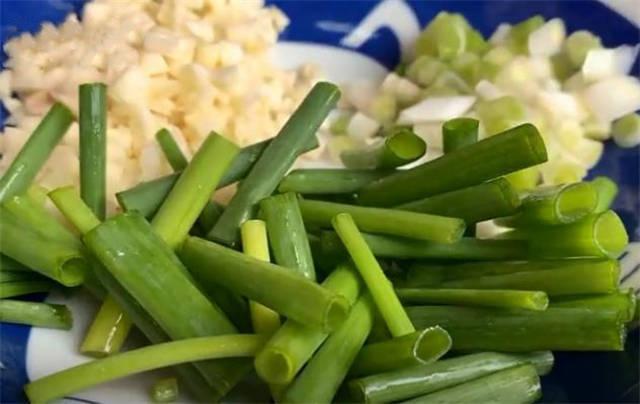 5.準備一把大蒜切片,大蒜是茄子的靈魂,這個是必須要放的,最后切成蒜末,切好放碗里面?zhèn)溆茫瑴蕚湟话研∈[,把蔥白和蔥葉分開切,蔥白切成末,放碗里面,蔥葉切成長段,放入碗中備用。