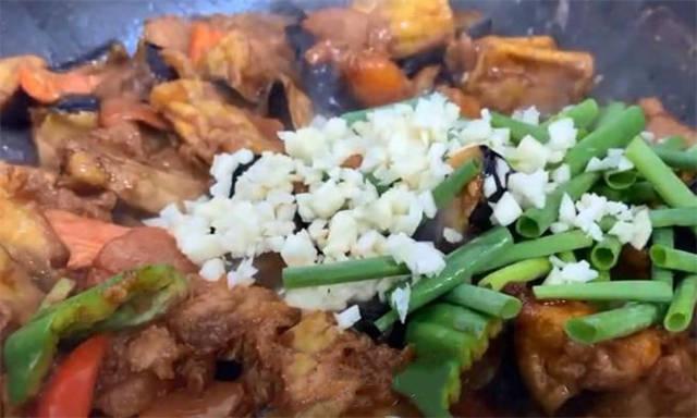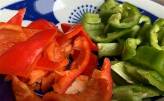 9.時間到,我們打開看看,這會兒就可以把青紅椒加進來了,翻炒至青紅椒斷生,炒好以后最后把蔥段和蒜末加進來,這個蒜末和蔥段一定要最后放,太早放就沒那么香了,翻炒均勻就可以出鍋了。