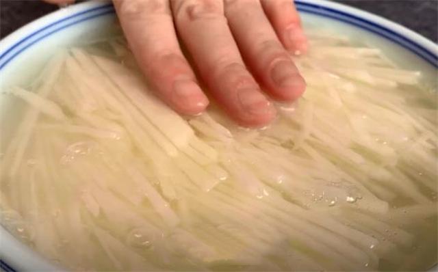 1.首先我們準(zhǔn)備一個(gè)土豆,把皮削掉,先把它切成薄片,盡量切得薄一些,口感會(huì)更好,再把它切成細(xì)絲,也可以直接用擦絲器擦成細(xì)絲,切好以后放進(jìn)一個(gè)大碗里面,往里面加入適量的清水,把它稍微浸泡一下,這樣可以把多余的淀粉泡下來。