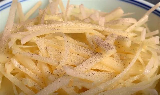 2.現(xiàn)在我們把土豆絲里面的水分倒掉,再往里面加入一勺食鹽,適量的胡椒粉,將它攪拌均勻,拌勻后放一邊備用。