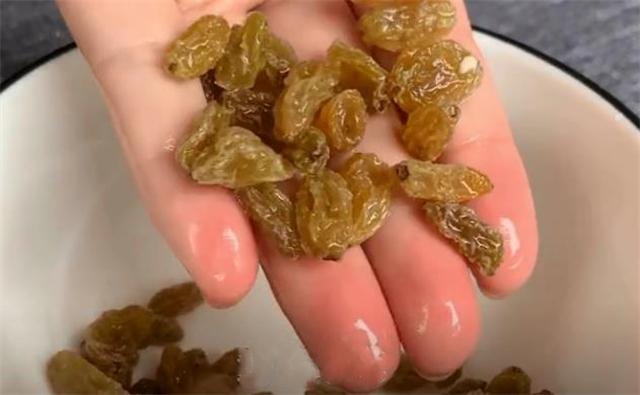 5.再準備一把葡萄干倒進碗里面,往里面加入一勺面粉,再加入清水清洗,因為葡萄干的表面有很多褶皺,加入面粉可以吸附掉表面的灰塵和臟東西,清洗一下用濾網把葡萄干過濾出來,再次加入清水,把葡萄干多清洗幾遍,像這樣就洗干凈了,放一邊備用。