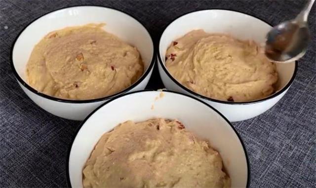 8.準備幾個小碗,在底部刷一層油,這樣可以防止粘黏,然后在碗里面加入幾粒葡萄干,再把面糊倒進碗里面,倒大半碗就可以了,不要放太滿,用勺子把表面鋪平整。