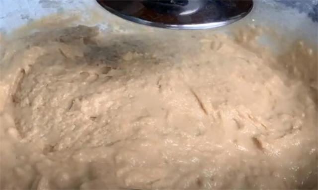 3.打好以后把香蕉奶昔倒進一個大碗里面,然后往里面加入4g酵母粉,20g白糖促進發酵,用筷子把它攪散,攪拌至酵母粉完全溶解,再往里面倒入150g的玉米面粉,200g的普通面粉,再次把它們攪拌均勻,攪拌成這種偏干一點粘稠的面糊就可以了,蓋上蓋子,醒發40分鐘左右。