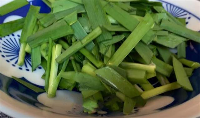 2.下面準備一把韭菜,把頭部去掉,然后把它切成3公分左右的長段,切好把它放進盤子里面備用。