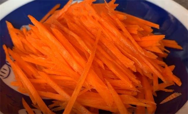 3.準備一根胡蘿卜去皮,去皮后先把它切成薄片,再切成細絲,盡量切得細一些,這樣比較容易熟,切好放進盤子里面備用。