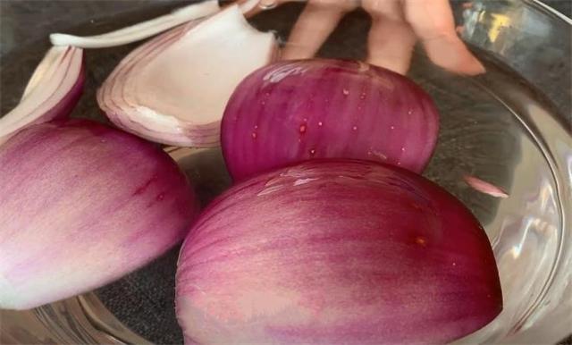 1.準備一個洋蔥,先把它對半切開,再切成四份,然后把它放進大碗里面,再往里面加入適量的清水,把它放一邊浸泡5分鐘。