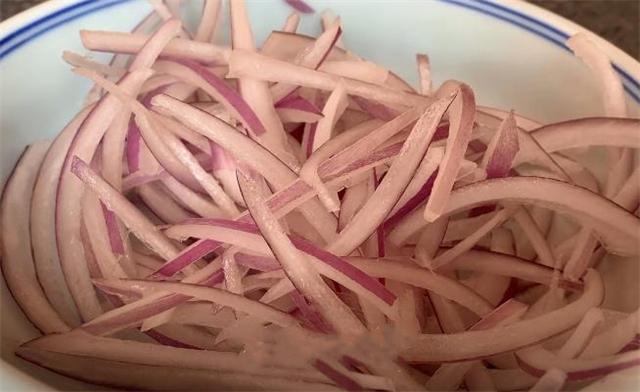 4.現在我們的洋蔥已經泡好了,把它撈出來放在案板上,將它切成細絲,盡量切得細一些,切好把它抖散,全部抖散以后把它放進盤子里面備用。