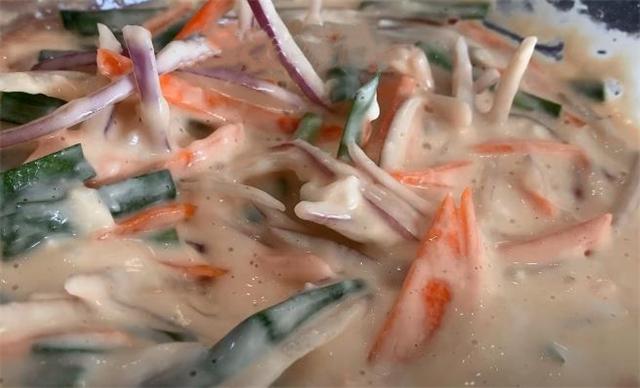 6.這會兒我們在一個大碗里面加入一小碗面粉,再加入適量的清水,邊加邊用筷子攪拌,攪拌得稍微稀一點,口感會更加的細膩,攪拌成粘稠的狀態把洋蔥倒進來,再次將它們攪拌均勻,攪拌成這種狀態就可以。