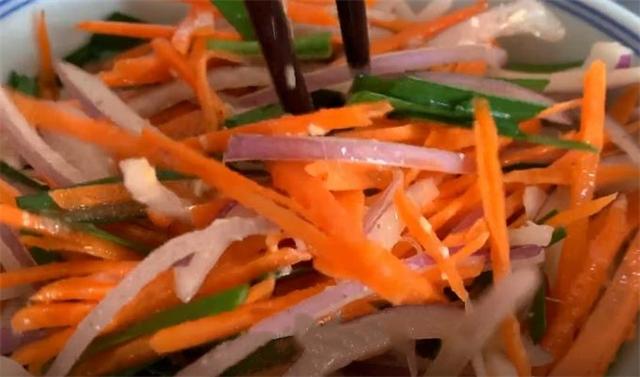 5.把胡蘿卜和韭菜加進洋蔥里面,一起攪拌均勻,拌勻后往里面加入一勺食鹽,一勺味精,適量的胡椒粉,再次將它攪拌均勻。