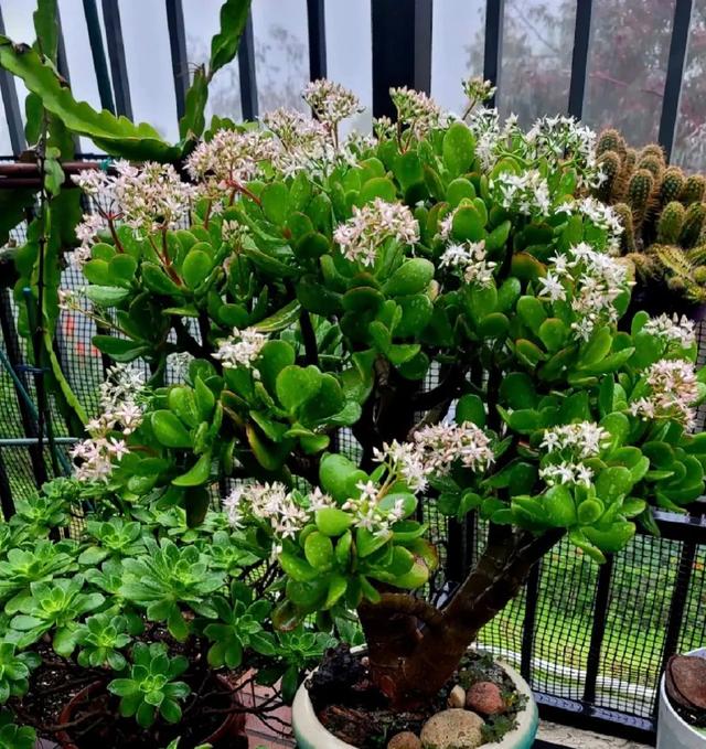 玉樹 玉樹的葉片像玉石,外形像樹,故名為玉樹,玉樹壽命長久,可以存活二三十年,等到第五年第六年的玉樹可以開花,被譽為滿樹銀花,好兆頭的象征。