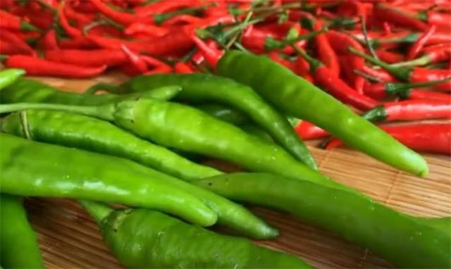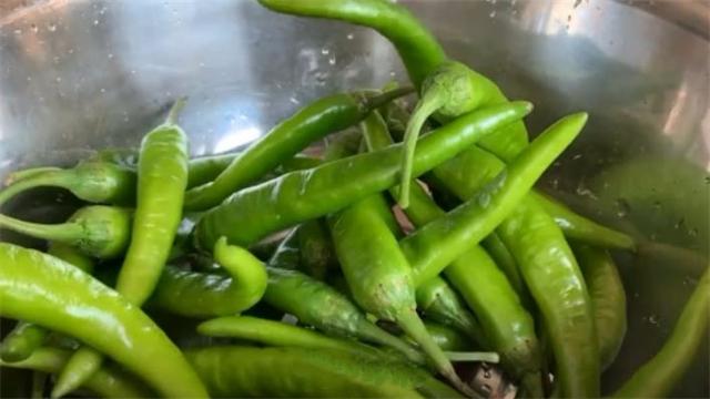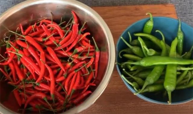 1.我今天買的是2斤小米辣,小米辣要選這種新鮮的,輔料是這種青色的杭椒,杭椒我買的是1斤,杭椒也要選這種新鮮的比較直的,小米辣和杭椒的比例是2:1。
