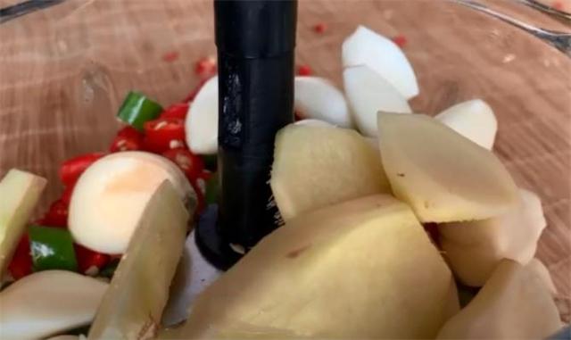 6.全部切好以后放進料理機里面,然后加入大蒜和生姜片,所有的辣椒大概要100g大蒜和100g生姜,然后將它們打成末。