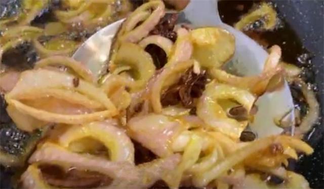 9.接下來我們來煉油,最好選擇菜籽油,因為菜籽油的煙點比較高,適合煎和炸,其他的油在長期高溫的情況下容易產生致癌物質,油溫至五成熱的時候把香料放進去炸,開小火慢慢的炸,一邊炸要一邊的攪拌,盡量把它炸的干一點,炸至所有的香料變得微微焦黃就可以了,然后把香料撈出來。