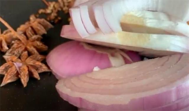 8.下面準備點配料,一個洋蔥,2根桂皮,3片香葉,一小把花椒,4個八角,把洋蔥切成片,放入碗中備用。