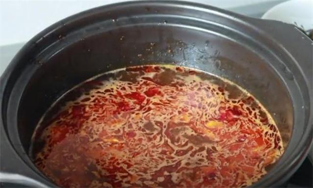 4.往砂鍋里倒入少量的油,油熱以后加入蔥姜蒜和干辣椒段進(jìn)去翻炒,再加入幾小塊的火鍋底料進(jìn)去翻炒,把火鍋底料炒化開(kāi),炒出它們的香味、麻味和辣味,然后往鍋里倒入多一些的開(kāi)水進(jìn)去,再加入生抽進(jìn)去,加一勺白胡椒粉進(jìn)去攪一攪。