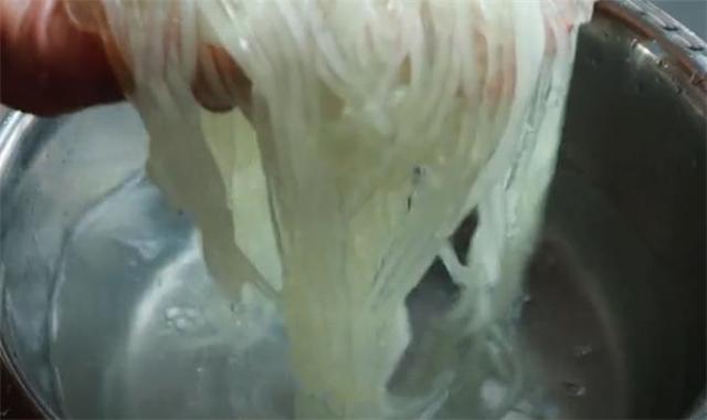 3.煮大約2分鐘就可以了,然后把煮好的土豆粉控水撈入涼水盆里,給大家看一下,做好的土豆粉透明勁道爽滑,用兩手使勁抻,也不會(huì)斷,接下來(lái)給大家分享一個(gè)簡(jiǎn)易版的砂鍋土豆粉做法。