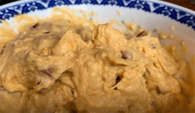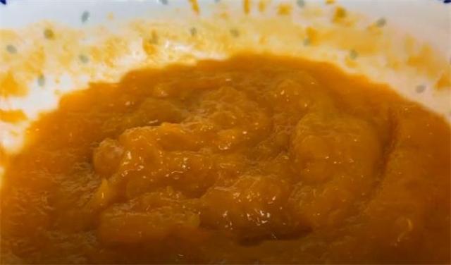 4.這會兒南瓜已經(jīng)蒸熟了,把它取出來,倒進(jìn)一個(gè)大碗里面,用勺子把南瓜搗成南瓜泥,搗成像這樣細(xì)膩無顆粒的狀態(tài)就可以了。
