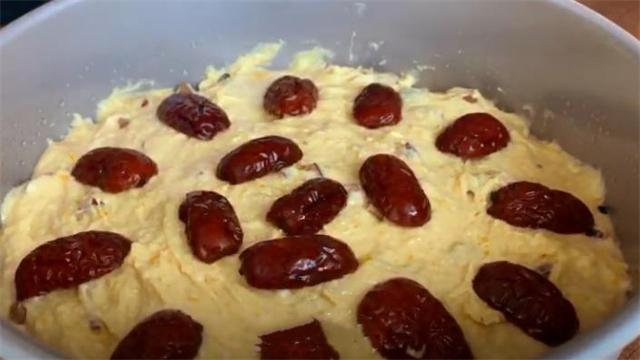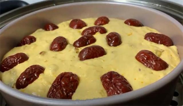 6.準(zhǔn)備一個(gè)模具,在底部和四周都刷上一層油,防止粘黏,再撒點(diǎn)黑芝麻增香,以方便脫模,再把面糊慢慢倒進(jìn)來,用勺子把表面鋪平整,鋪平以后把切好的紅棗一個(gè)一個(gè)的擺上去,像這樣就可以了,蓋上蓋子醒發(fā)40分鐘。