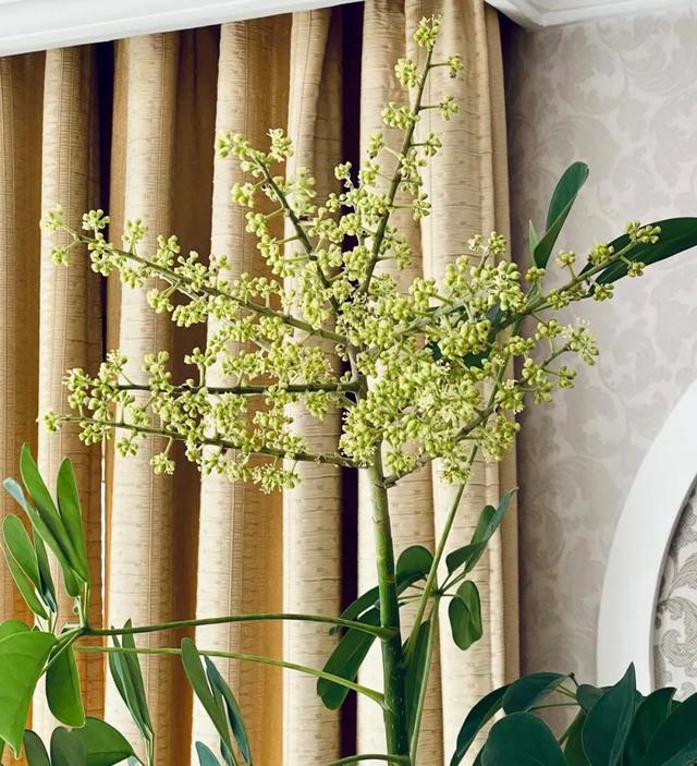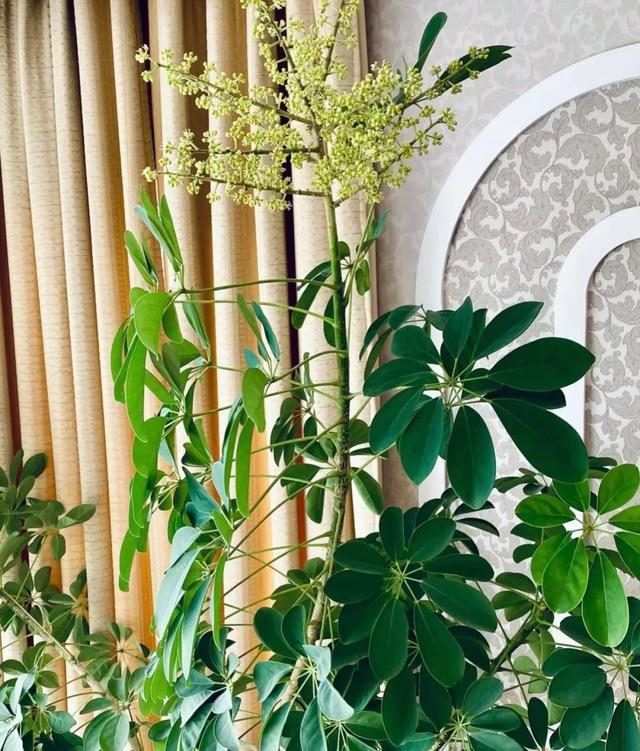 其實鴨掌木還有改變空氣質量的作用,尤其是可以吸收二手煙和甲醛。所以很多人都是鴨掌木的小迷妹,通常會在客廳和陽臺放一盆,也可以把小型的鴨掌木擺放在桌面上,更加清新獨特。 可能很多人都沒見過鴨掌木開花吧,它的花朵觀賞價值并不高,就像一顆顆黃綠色的小豆子,如圖所示,據說這棵瓶鴨掌木也是了七八年之后才開花的。在老人看來,這種難開花的植物一旦開花,都是好兆頭,并不僅僅是迷信在作祟。希望看到這里的你也能夠帶走好運。