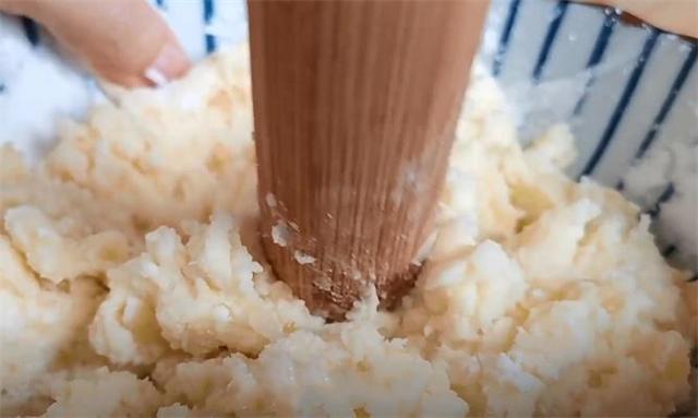 2.土豆蒸熟后把它取出來,倒進一個大碗里面,再加入一半量的土豆淀粉,加入一勺食鹽,用搟面杖把它搗碎,搗成這種細膩的土豆泥就可以了。