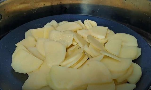1.先準備一個大土豆洗凈去皮,再對半切開,切成薄片,切好放入盤子里面,然后把它鋪平,放進蒸鍋,蓋上蓋子,開大火蒸15分鐘。