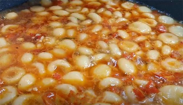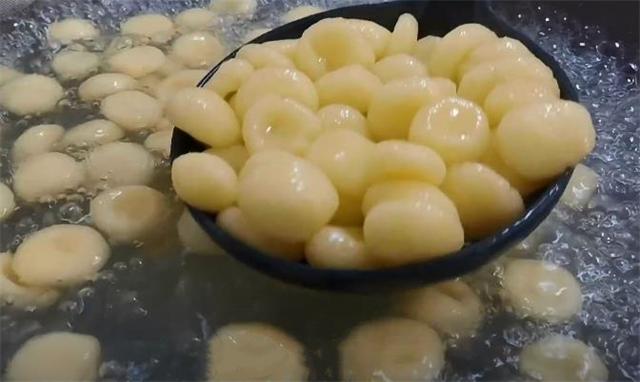 5.鍋中燒一鍋開水,水開以后下入土豆窩窩,用鏟子輕輕攪動一下,防止黏在一起,煮至土豆全部浮起來變透明就說明已經熟了。