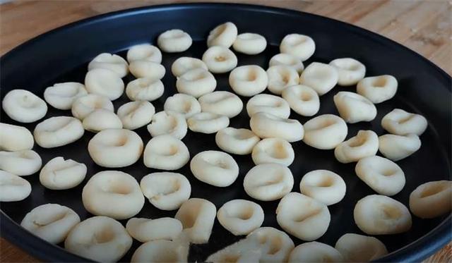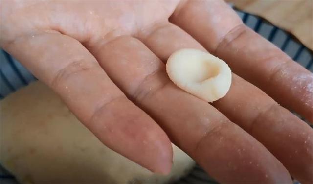 3.然后下手把它揉成,揉光滑就可以了,再把它團成小丸子,用小拇指從中間摁出一個窩窩,像這樣就可以了。