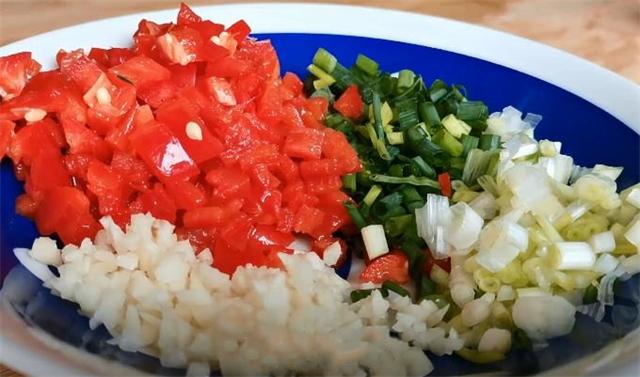 7.下面準備點配菜,準備一根紅椒切開,再切絲,最后切成小碎丁,放入碗中,準備一把小蔥,把蔥綠切成蔥花,蔥白切成末,放入碗中,準備兩瓣大蒜切成蒜末,放入碗中備用。