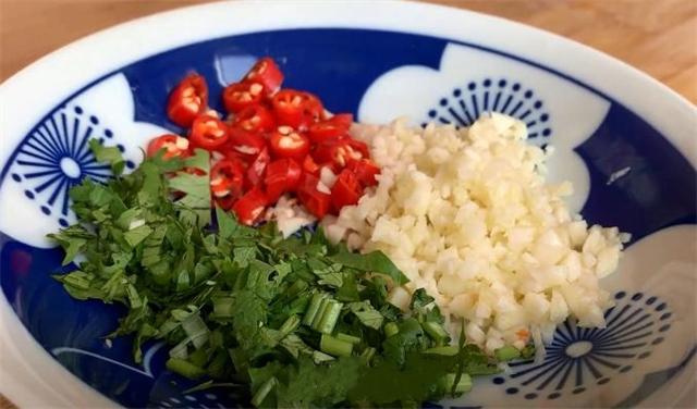 3.下面準(zhǔn)備點配料,準(zhǔn)備三根小米辣切成小段,再準(zhǔn)備4瓣大蒜切成蒜末,切好放進碗里面,準(zhǔn)備一小把香菜切碎,放入碗里。