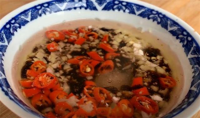4.接下來調(diào)個料汁,把蒜末和小米辣放進一個小碗里面,燒點熱油澆在上面,再往碗里面加入3勺生抽,3勺香醋,一勺白糖提鮮,攪拌均勻備用。