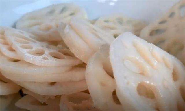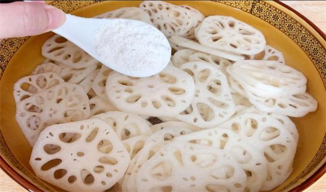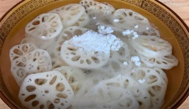1.先將蓮藕去掉外皮,去皮后用刀切成薄片,切開以后可以看到里面有很多的淤泥,甚至還有很多蟲卵是肉眼看不見的,下面用一個很簡單的方法將淤泥和蟲卵清洗掉,把切好的藕片裝進一個大碗里面,然后加入清水沒過藕片,加入一勺食鹽,食鹽可以起到殺菌的作用,再加入幾滴白醋,白醋可以防止藕片氧化變黑,再加入一小勺面粉,面粉可以有效的將淤泥和蟲卵吸附出來,把它攪拌均勻,放一邊浸泡3分鐘。