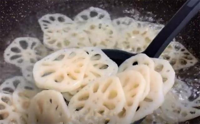 4.接下來在鍋里面加入適量清水,蓋上蓋子開大火燒開,燒開以后加入幾滴白醋,一勺食鹽,把蓮藕倒進去焯一下水,放白醋焯水蓮藕不會發黑,焯水一分鐘后把蓮藕撈出來過一下涼白開,這樣藕片吃起來才會更加清脆。