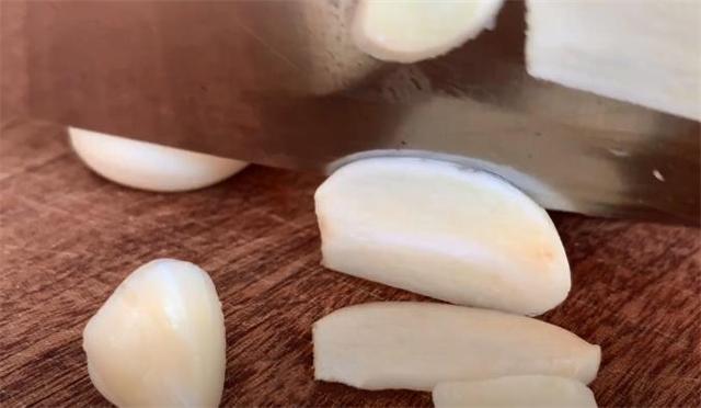 3.下面準(zhǔn)備一頭大蒜,把它全部去皮,去皮后把大蒜全部切成片,切好放一邊備用。