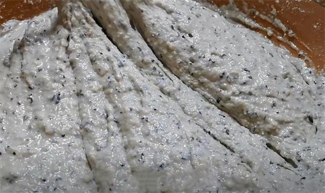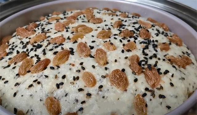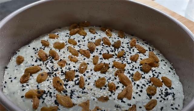 4.準(zhǔn)備一個模具,在底部和邊緣都刷上一層油,防止粘黏,再撒點(diǎn)熟芝麻增香,這樣也比較容易脫模,再把黑豆面糊倒進(jìn)來,用勺子把面糊表面鋪平,鋪平以后在表面擺上一點(diǎn)葡萄干,然后在表面也撒上一點(diǎn)熟芝麻,蓋上蓋子發(fā)酵至兩倍大,大概40分鐘左右。
