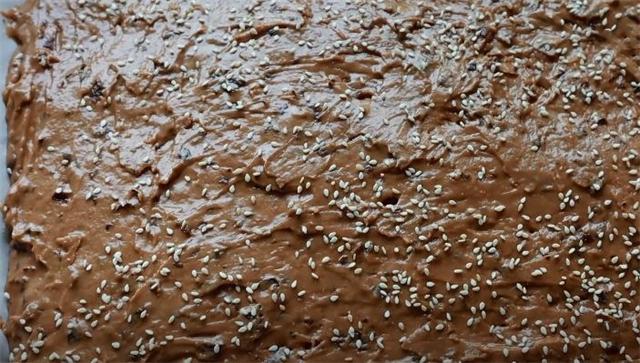 4.翻拌均勻后倒在鋪有吸油紙的烤盤里,均勻地攤開,上面再均勻地撒一些白芝麻。