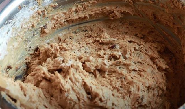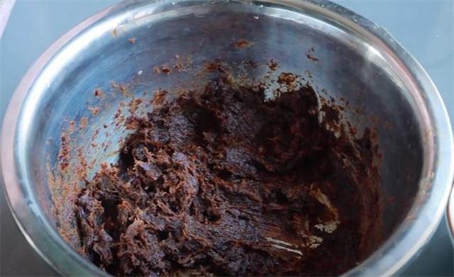 2.然后把蒸好的紅棗倒進盆里面,再用工具把紅棗搗碎成泥,棗泥搗得越細膩越好,棗泥搗好后,順便把里面的棗核挑出來。