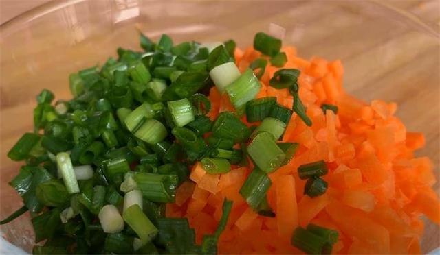 1.準備一根胡蘿卜先削去皮,然后切片,再切絲,最后切成小碎丁,切好放入碗中,再準備一把小蔥,切成蔥花,切好跟胡蘿卜放在一起。