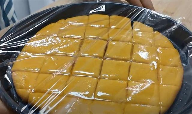 6.準備一個盤子,在底部刷一層油,把面塊全部放進盤中,然后在面塊的表面也刷上一層油,蓋上保鮮膜醒面2-3個小時,如果是早上吃可以提前一天揉好面放冰箱。