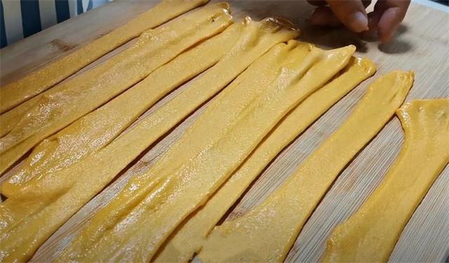 7.現在面塊已經醒好了,取出一個小面塊,捏住兩端輕輕的把它拉長,在案板上邊拍打邊拉,這樣做出來的面非常勁道,拉好平鋪在案板上。