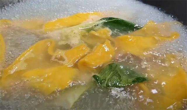 8.拉出的面夠煮一鍋就可以了,剩下的放冰箱下次再吃,鍋中燒點開水,把拉好的面條下進去,用筷子攪動一下,防止面條黏在一起,煮兩分鐘后面條差不多熟了,再加入幾片青菜燙一下。
